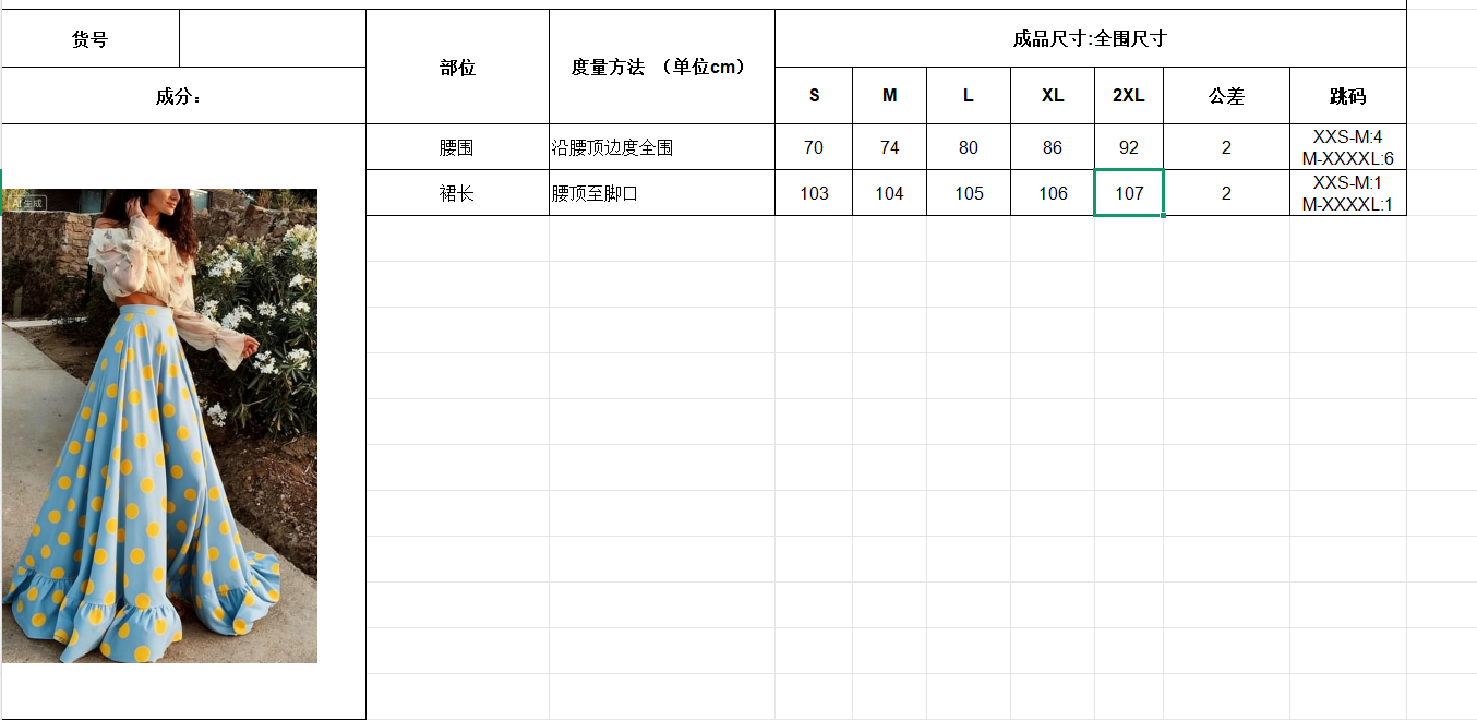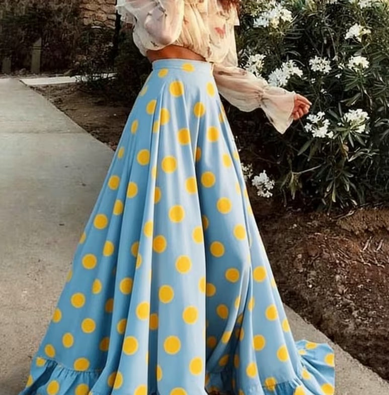 Cut: High-waisted, full-skirted long skirt with polka dot pattern
